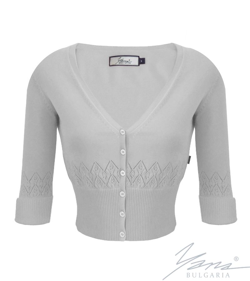 The women's cotton fit cardigan sweater of "YANA" Ltd. in flat knit with delicate openwork motifs, elongated elastic band and V-neck, is extremely convenient and comfortable to wear, thanks to the best knitting world practices used. The cardigan has a cut that gives freedom to the body when moving, it is fully fashion knitted, without cutting. The cardigan is fastened with 6 buttons, and 2 more for each sleeve for decoration. Highest production standards for 100% cotton. The most environmentally friendly finish thanks to the Swiss company THIES GmbH. The shirt has a stylish cut, in line with the latest fashion trends, fully fashion knitted, without cutting. The latest colors for the Spring-Summer season. Ideal for the city, for sea and mountains.